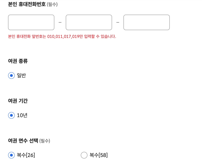 3. 본인 휴대폰 번호와 여권 종류, 기간, 면수를 선택해 주세요.