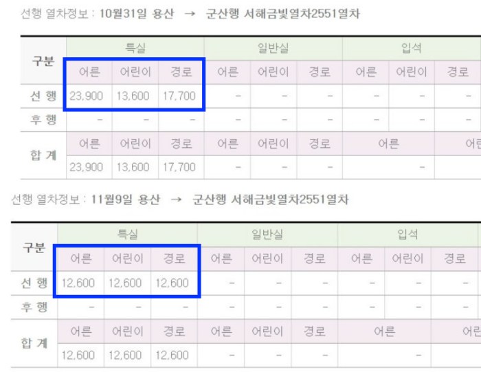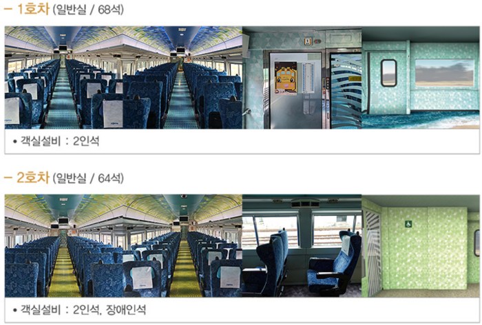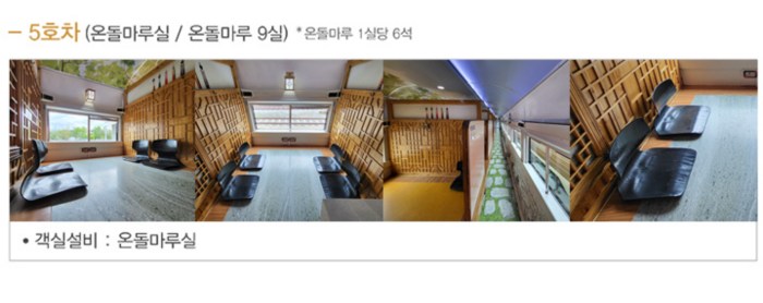 서해 금빛 열차는 1~4호차는 일반실, 5호차는 온돌마루실로 구성되어 있습니다. 온돌마루실은 3인 이상 예약시 예매가 가능하고 온돌 가격은 별도로 40,000원이 들어갑니다.
