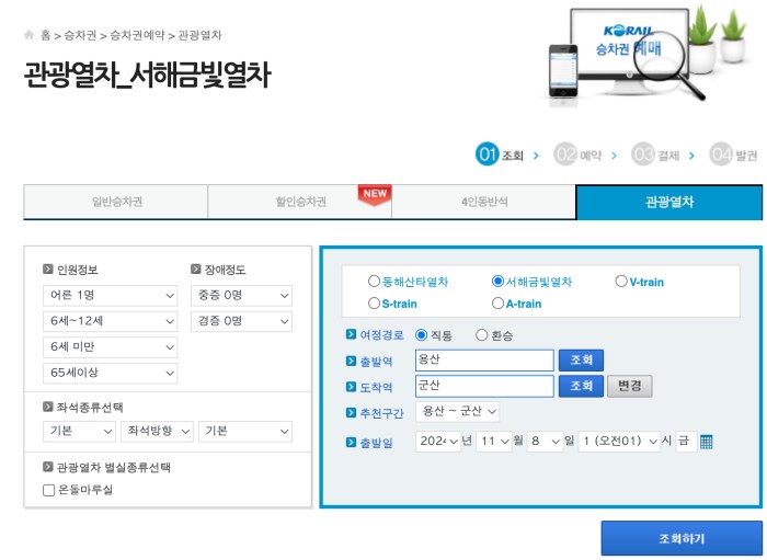 서해 금빛 열차는 인기가 매우 많은 열차이기 때문에 빠르게 예약하는 것이 좋습니다. 아래의 코레일 홈페이지에서 좌석 조회 후 예매 할 수 있습니다.