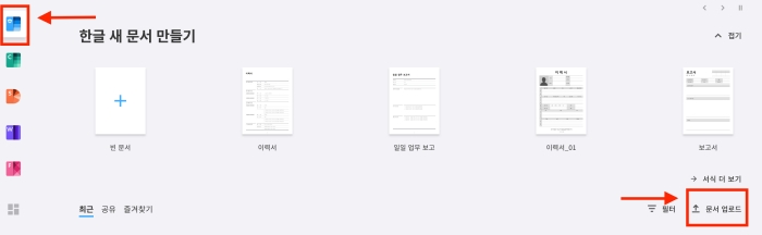 4. 로그인 후 좌측 한글 탭 선택 > 문서 업로드를 선택하시면 한글파일 열기 및 편집 할 수 있습니다.
